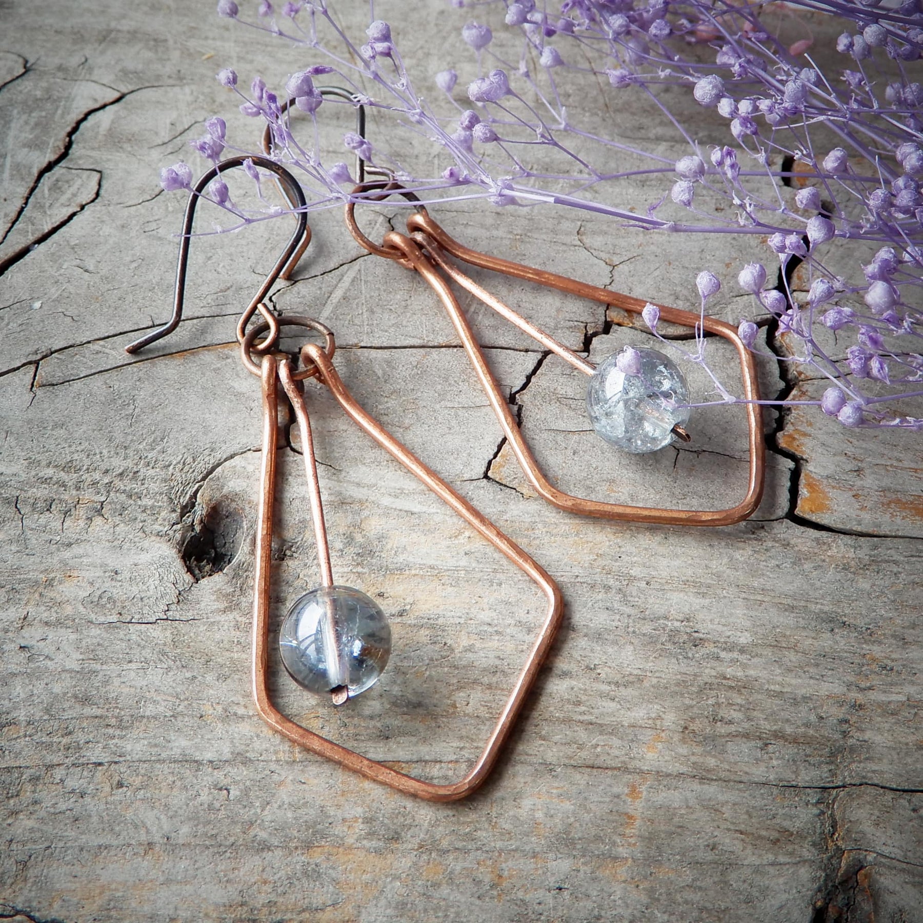 Unique, dangly, geometric copper dangle earrings add a unique touch to your day. Handcrafted in my studio from wire and a flash-coated crystal stone, these are simple, minimalist and eye-catching at the same time.