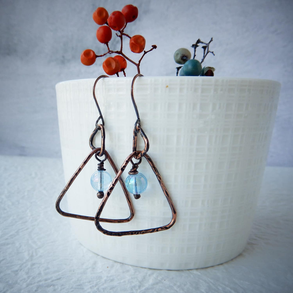 Cute and unique, these handcrafted Copper Triangle Dangle Earrings feature a rare and unusual Aqua Aura Quartz stone.