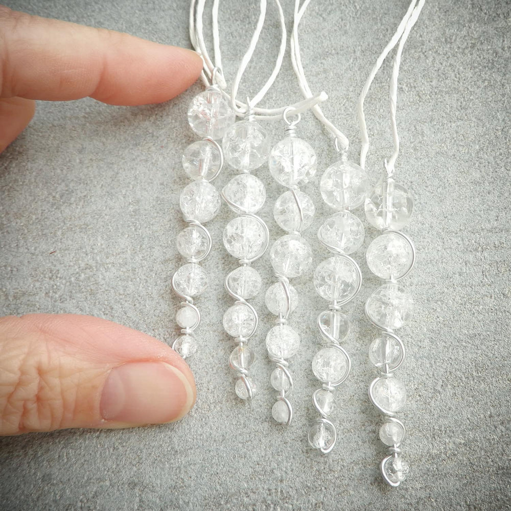 Handmade crystal icicle Christmas ornaments add a classic touch of sparkle and shine on your tree and holiday season! Genuine cracked crystals on aluminum silver wire like drops of ice after a snowstorm that will never melt and leave a puddle on the floor.